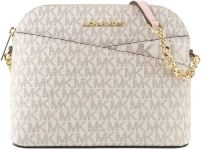 תיק צד זה של מייקל קורס מאופיין בצורת כיפה מובנית ובהדפס הלוגו הייחודי של המותג, בשילוב רצועה עם גימור שרשרת מתכתית